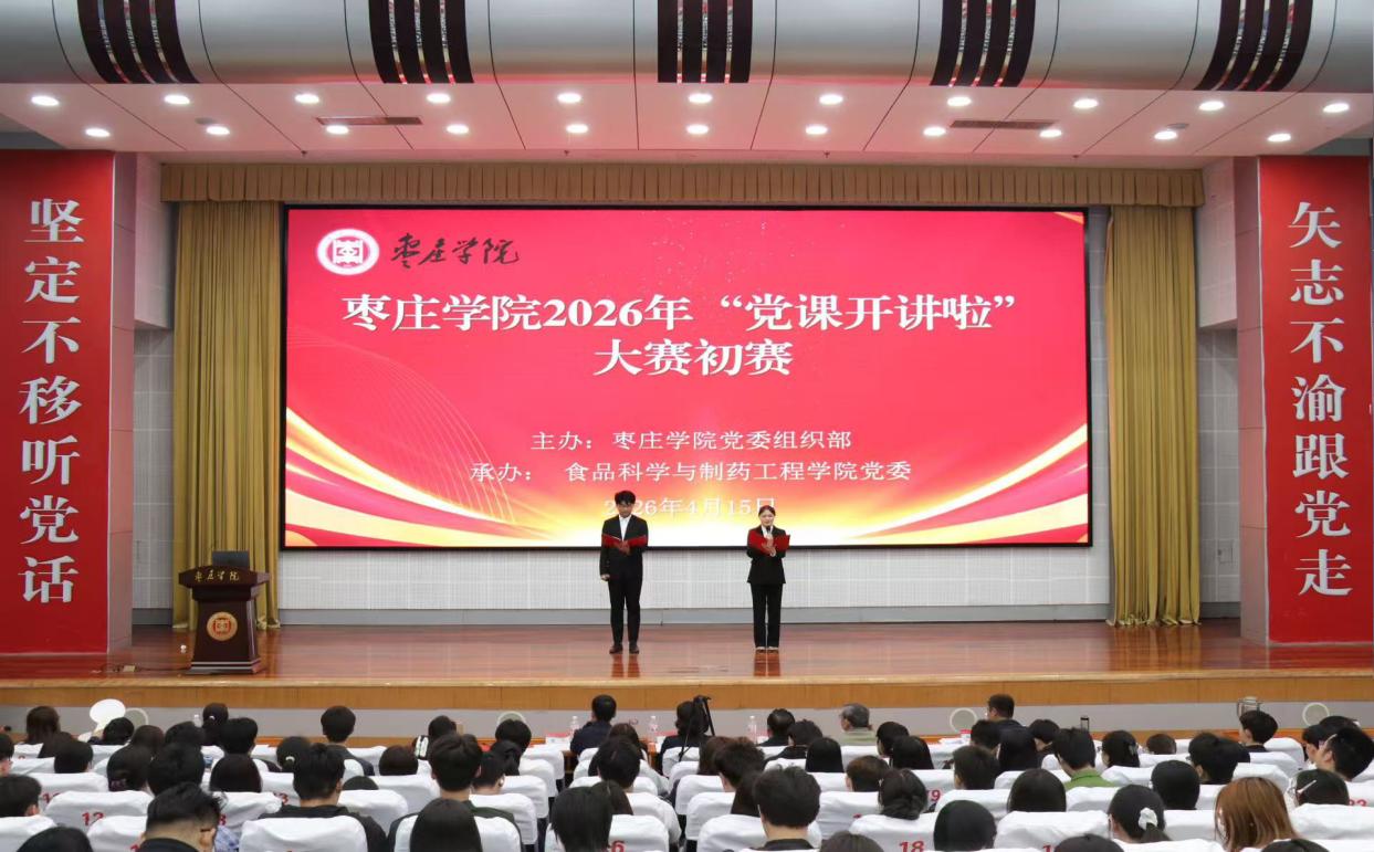 为深入贯彻新时代党的建设总要求,庆祝中国共产党成立105周年,扎实推进“党建好案例、书记好党课、党员好榜样”系列活动走深走实,4月15日下午,由学校党委组织部主办、食品科学与制药工程学院党委承办的枣庄学院2026年“党课开讲啦”初赛在市中校区综合楼报告厅顺利举行。初赛以“凝心铸魂守初心 争先创优勇担当”为主题,旨在以赛促学、以讲促悟,推动党员教育入脑入心。比赛现场,各位参赛选手紧扣主题主线,聚焦习近平新时...